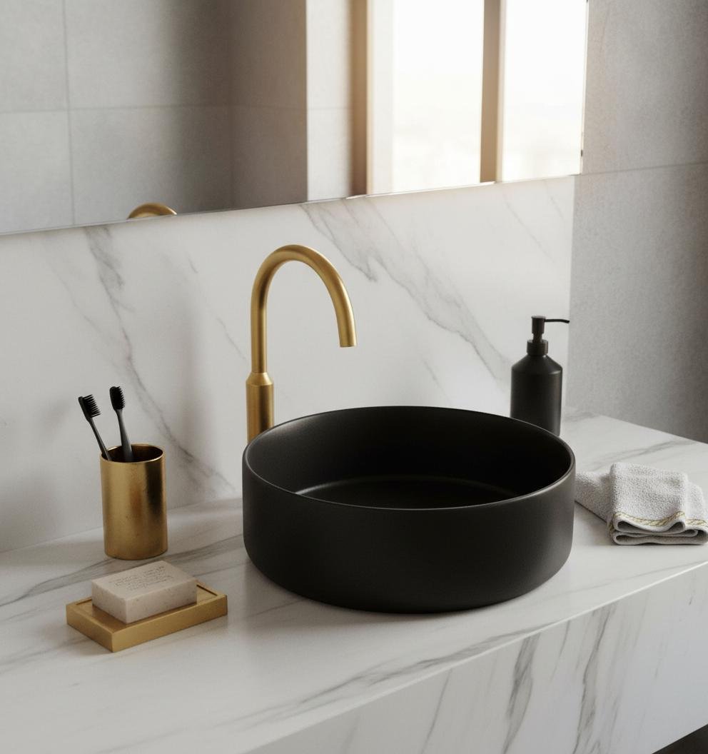The Starvoll G31 Above Counter Art Basin features a sleek round design with a matte black finish, perfect for modern bathrooms. Crafted for duarbilty and style, this above counter wash basin adds a bold, elegant touch to any vanity.